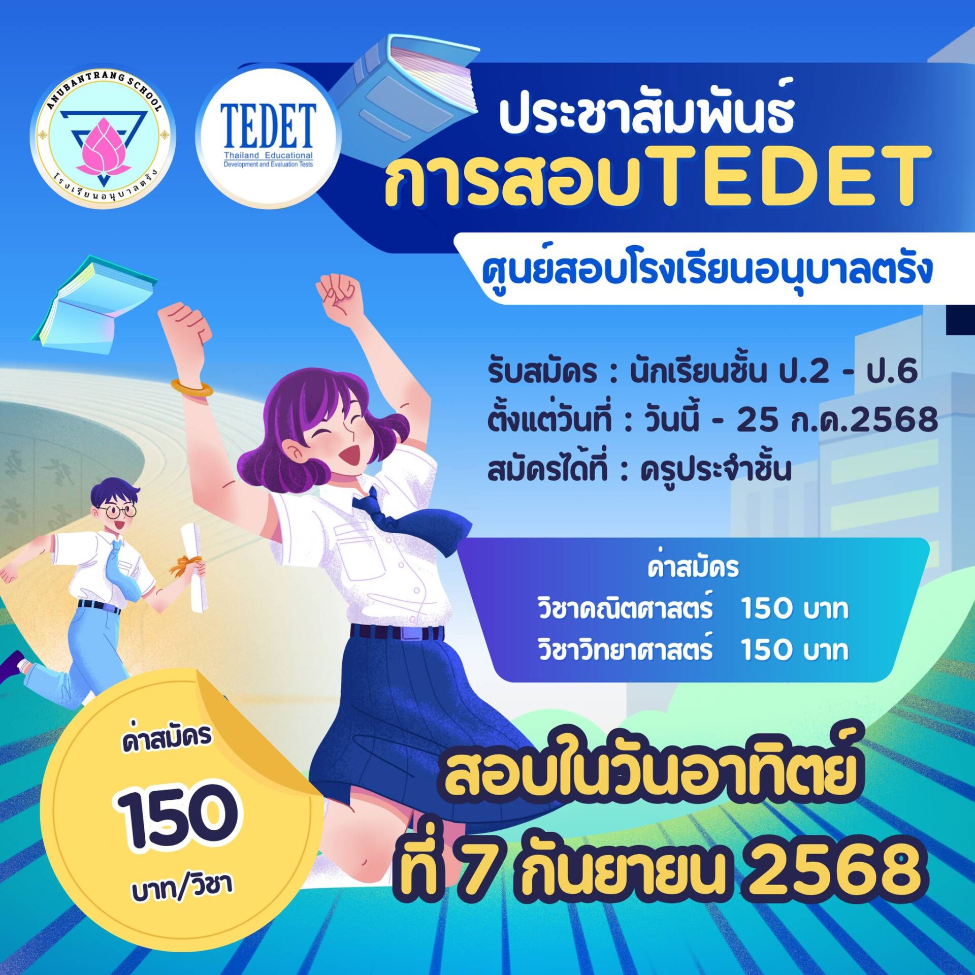 โรงเรียนอนุบาลตรังประชาสัมพันธ์การรับสมัครสอบ TEDET ณ ศูนย์สอบโรงเรียนอนุบาลตรัง โดยรับสมัครนักเรียนระดับชั้นประถมศึกษาปีที่ 2- ชั้นประถมศึกษาปีที่ 6 วิชาวิทยาศาสตร์ และวิชาคณิตศาสตร์ ตั้งแต่วันศุกร์ที่ 20 มิถุนายน – วันศุกร์ ที่ 25 กรกฎาคม 2568 ทั้งนี้ผู้ปกครองสามารถติดต่อการสมัครสอบที่คุณครูประจำชั้น