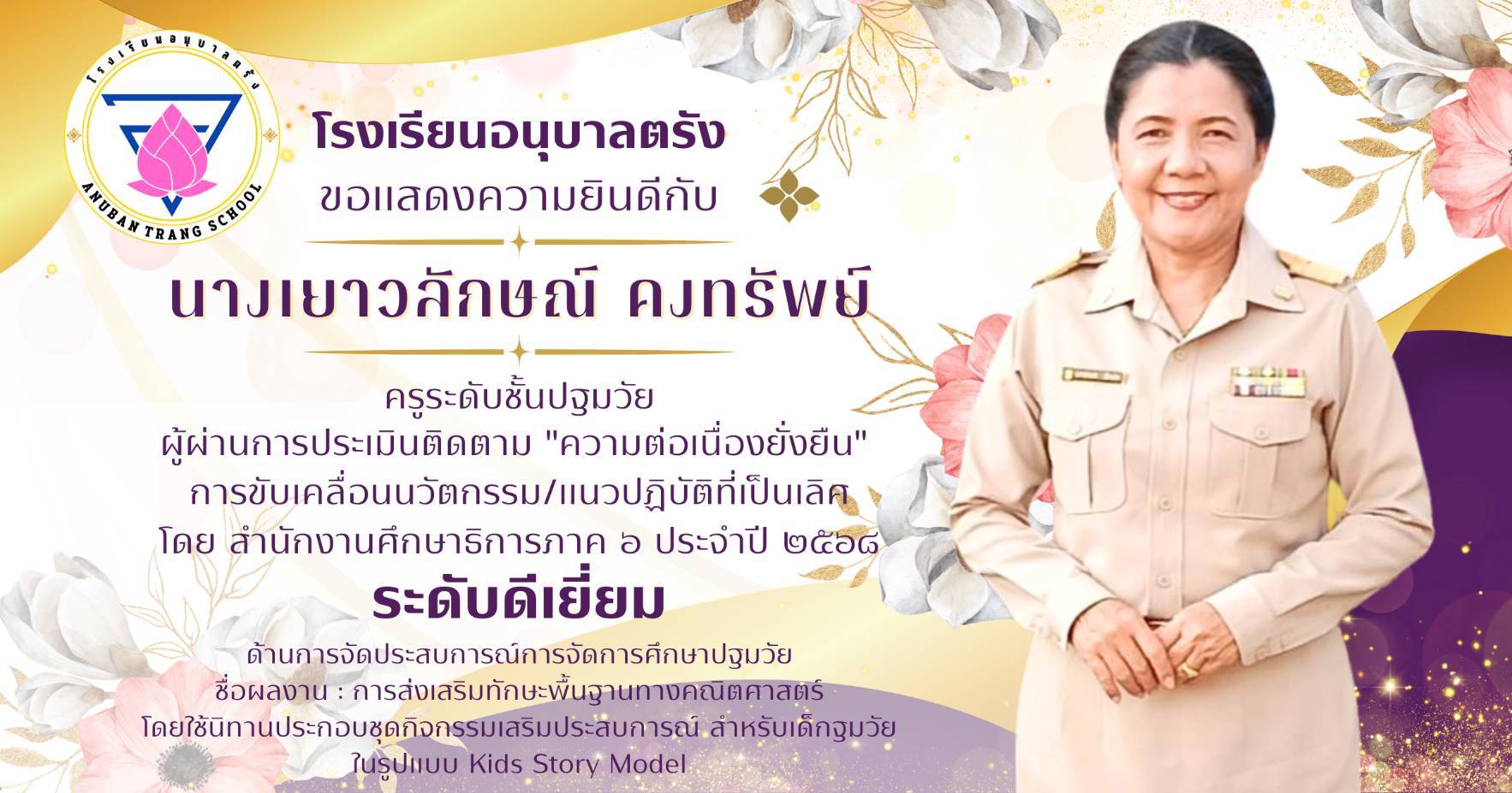 โรงเรียนอนุบาลตรัง ขอแสดงความยินดีกับนางเยาวลักษณ์ คงทรัพย์ ครูระดับชั้นปฐมวัย ผู้ผ่านการประเมินติดตาม “ความต่อเนื่องยั่งยืน” การขับเคลื่อนนวัตกรรม/แนวปฏิบัติที่เป็นเลิศ โดยสำนักงานศึกษาธิการภาค 6 ประจำปี 2568 ระดับดีเยี่ยม ด้านการจัดประสบการณ์การจัดการศึกษาปฐมวัย ชื่อผลงาน : การส่งเสริมทักษะพื้นฐานทางคณิตศาสตร์ โดยใช้นิทานประกอบชุดกิจกรรมเสริมประสบการณ์ สำหรับเด็กปฐมวัยในรูปแบบ Kids Story Model
