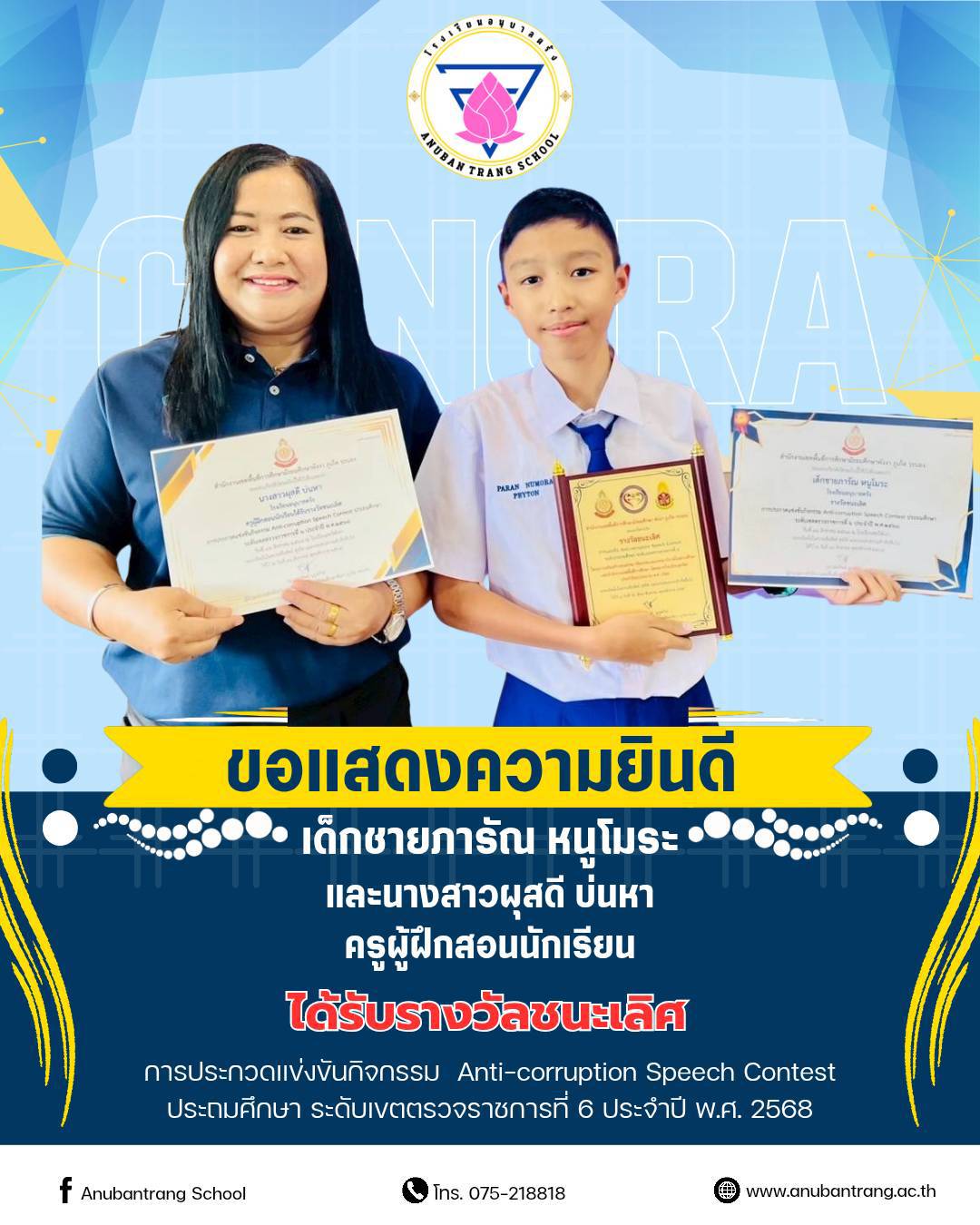 ขอแสดงความยินดีกับเด็กชายภารัณ หนูโมระ นักเรียนโรงเรียนอนุบาลตรังและนางสาวผุสดี บ่นหา ครูผู้ฝึกสอนนักเรียน สังกัด สพป.ตรัง เขต 1 ได้รับรางวัลชนะเลิศ การประกวดแข่งขันกิจกรรม Anti-corruption Speech Contest ประถมศึกษา ระดับเขตตรวจราชการที่ 6 ประจำปี พ.ศ. 2568