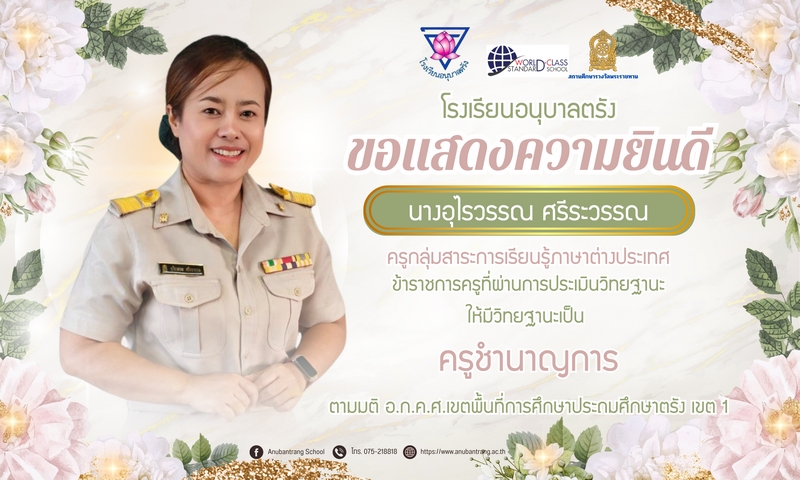 โรงเรียนอนุบาลตรัง ขอแสดงความยินดี นางอุไรวรรณ ศรีระวรรณ ครูกลุ่มสาระการเรียนรู้ภาษาต่างประเทศ ข้าราชการครูที่ผ่านการประเมินวิทยฐานะให้มีวิทยฐานะเป็นครูชำนาญการ ตามมติ อ.ก.ค.ศ. เขตพื้นที่การศึกษาประถมศึกษาตรังเขต 1